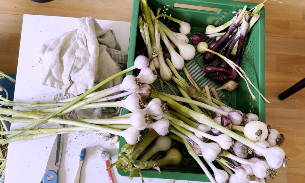 Almost every day brings fresh rain around here at the moment. Many days, we are forced to work around the weather–and take breaks when it rains. Or we ignore the weather and go to the garden anyway. On a rainy day, we made strawberry jam, then rescued the garlic from the non-stop rain by harvesting it and sorting it in my living room.