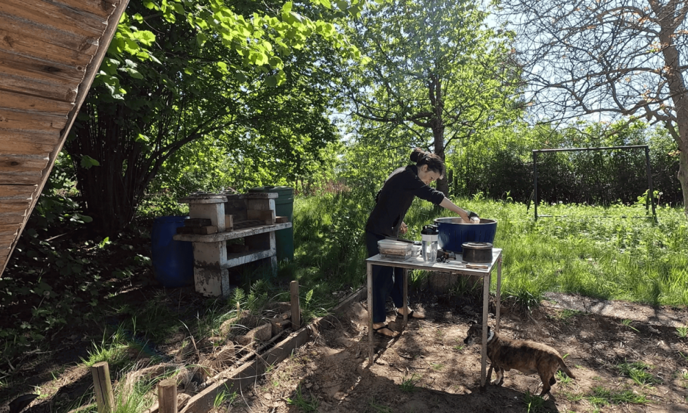 Despite rain and mosquitoes, Pepper and I get a lot done in the garden. After checking on what my husband did the day before, we harvest some currants, string-trellis some tomatoes, cook a delicious dinner from volunteer potatoes, and return the next day to continue a new bed.